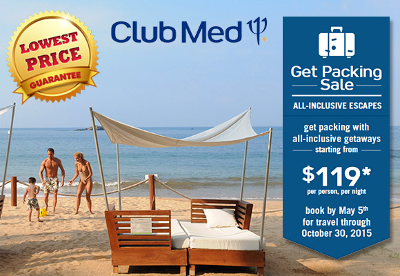 | Disclaimer: * Sample price is per person, based on double occupancy in a Club category room on select weeks at Ixtapa Pacific, Mexico and Sandpiper Bay, Florida. Prices on other dates and/or at other resorts may vary. Blackout dates apply, including holidays and other dates. Offer requires a 3-night minimum stay (7-night minimum for Columbus Isle). Available at select resorts. Does not include airfare. Valid for new individual bookings only for select travel dates through October 30, 2015 and must be booked by May 5, 2015. Offer is subject to capacity control and may increase at any time. †Children aged under 4 years stay for free at our family destinations. Children aged 4-11 years stay at up to 50% off adult price at select family resorts. Children aged 12-15 years stay at up to 40% off adult price at select family resorts. For flights that are booked through Club Med, tickets for children must be paid for by the client. Children who are eligible to stay for free must be lodged in the same room as the adults who are paying for their stay, or in a connecting room. Blackout dates may apply. Costs associated with Baby & Petit Club Med are at full day rate during entire stay booked. General Conditions: Blackout dates apply, including holidays and other dates. For Turkoise all guests must be 18 and older. Guests at Columbus Isle must be 2 and older. Club Med Membership fees of $60 per adult and $30 per child are additional. Other restrictions apply including brochure terms and cancellation/change fees. Not responsible for errors or omissions. Void where prohibited or restricted by law. CST#: 2020955-50. *Sample $400 air credit is per person, based on a 7-night stay in a Suite category room at Club Med Punta Cana, Dominican Republic. Sample $200 air credit is per person, based on a 7-night stay in a Club category room at Club Med Punta Cana, Dominican Republic. Children between 13 and 15 years of age receive 60% of the air credit of an adult. Children between 4 and 12 years of age receive half of the air credit of an adult. Children under 4 do not receive an air credit. Credits on other dates, resorts, stay duration, room categories may vary. Offer requires a 3-night minimum stay and air must be booked through Club Med. Offer available only for Punta Cana, Dominican Republic; Cancun Yucatan, Mexico; Buccaneer’s Creek , Martinique and La Caravelle, Guadeloupe. Valid for new individual bookings only for select travel dates from June 27,2015 through August 15, 2015 and must be booked by June 24, 2015, subject to capacity control and may increase at any time. General Conditions: Blackout dates apply, including holidays and other dates. Club Med Membership fees of $60 per adult and $30 per child are additional. Other restrictions apply including brochure terms and cancellation/change fees. Not responsible for errors or omissions. Void where prohibited or restricted by law. CST#: 2020955-50. |